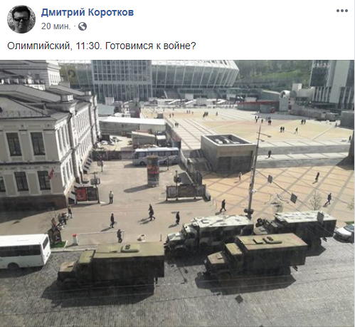 Также там замечена тяжелая техника. "Олимпийский, 11:30. Готовимся к войне?" - опубликовал фото журналист Дмитрий Коротков.