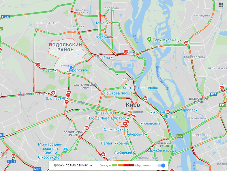 Отметим, что на правом берегу пробки зафиксированы на улицах Набережно-Луговой, Юрия Ильенко, Вячеслава Черновола, Вадима Гетьмана, Борщаговской, Васильковской, Саперно-Слободской, Крещатике, Большой Житомирской. Также пробки на Воздухофлотском, Валерия Лобановского, Голосеевском и на бульварах Дружбы Народов и Леси Украинки. Отметим, что затруднено движение транспорта на Набережном шоссе.