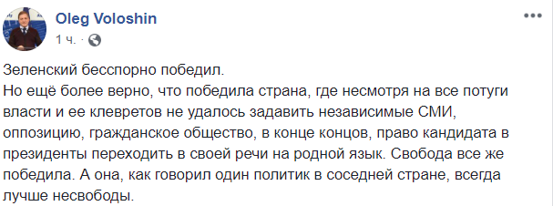 Но ещё более верно, что победила страна, где несмотря на все потуги власти и ее клевретов не удалось задавить независимые СМИ, оппозицию, гражданское общество, в конце концов, право кандидата в президенты переходить в своей речи на родной язык. Свобода все же победила. А она, как говорил один политик в соседней стране, всегда лучше несвободы", - пишет политолог Олег Волошин.