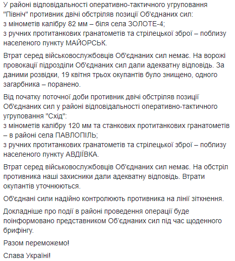 "Враг также обстреливал наших защитников из гранатометов различных систем, крупнокалиберных пулеметов и стрелкового оружия… Потерь среди военнослужащих Объединенных сил нет" - говорится в сообщении.