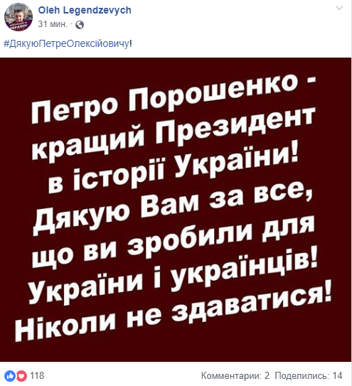 Встречу "Дякую, Петре!" в группах соцсети Facebook назначают на 19:00. Приглашение оформлено с целью выразить благодарность Петру Порошенко за все, что сделано за последние 5 лет. "Давайте придем и поблагодарим Петра Порошенко за все, что сделано за эти 5 лет, за ассоциации, безвиз, армию, децентрализацию и все остальное", - говорится в анонсе встречи.