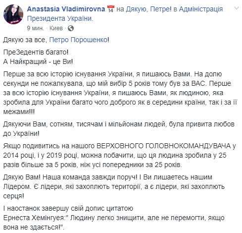 Как можно узнать из записей на странице мероприятия, встречу планируют провести до 22:00. Сторонники Порошенко призывают приходить с плакатами, листовками и значками "я голосовал за Порошенко". В хвалебном стиле написаны все посты, размещенные в это время в группе Порошенко после его краха.