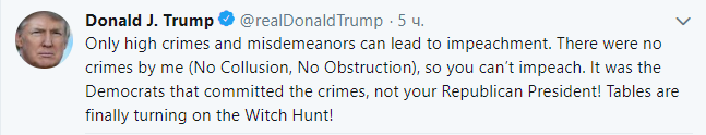 "Только серьезные преступления и нарушения могут привести к импичменту. Я преступлений не совершал (не было сговора, не было препятствования правосудию), поэтому невозможно объявить мне импичмент", - написал он в Twitter. "Это демократы совершали преступления, а не ваш президент-республиканец!" - добавил Дональд Трамп.