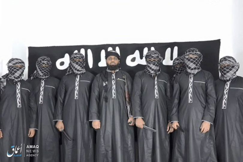 Изображение обнародовало информационное агентством Amaq – рупор "Исламского Государства". Семь мужчин закрыли свои лица, впрочем террористическая группировка ранее называла их имена - это Абу Убайда Абу аль-Мухтар, Абу Халил, Абу аль-Бара, Абу Мухаммед и Абу Абдулла. Все мужчины на фото стоят перед флагом "ИГИЛ".