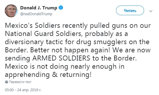 Президент США Дональд Трамп в среду, 24 апреля, заявил о том, что на границу США и Мексики будут направлены американские солдаты. Об этом он написал в своем Twitter.