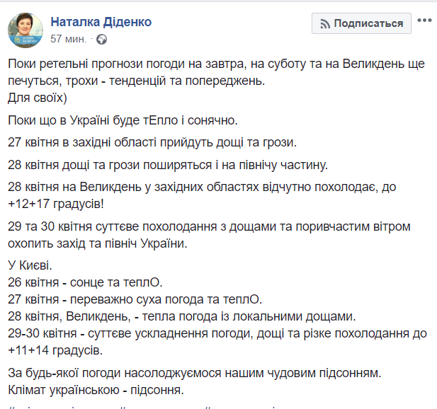 Кроме того, по словам Диденко, 28 апреля на Пасху в западных областях ощутимо похолодает, до +12...+17 градусов. 29 и 30 апреля существенное похолодание с дождями и порывистым ветром охватит запад и север Украины.