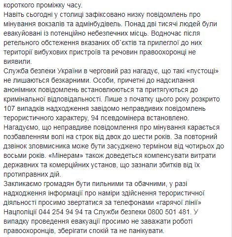 "Только в течение последней недели в разных регионах Украины зафиксировано 93 ложных анонимных сообщения, поступившие по телефонной связи, а также были направлены через Интернет. Подавляющее большинство этих месседжей носит серийный характер: осуществляется либо рассылка писем с одного электронного адреса, или волна звонков о минировании поступает в течение короткого промежутка времени… Более двух тысяч человек были эвакуированы из потенциально опасных мест. В то же время после тщательного обследования указанных объектов и прилегающей к ним территории взрывных устройств и веществ правоохранители не обнаружили", - говорится в сообщении.