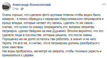 "Очень хорошо, что сделали фото крупным планом чтобы видно было номерок - я лично обращусь к иерархам Иерусалимского патриархата и прошу владык, которые читают эту запись, сделать то же самое - считаю, что нужно по номеру определить кто, вопреки запретам патриарха, сделал бейджик на имя Дудченко. Вполне вероятно, что это сделали люди в посольстве, которые решили, что после смены Порошенко им не долго осталось там работать, а значит и нечего терять. Но все же, я считаю, что в патриархии должны разобраться с этим хамством. Как воры пробрались, несмотря на запреты, чтобы тихонько украсть и примазаться к Церкви", - написал Вознесенский.