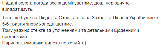 Теплее будет на Юге и Востоке, а вот на Западе и Севере Украины уже с 5-6 мая снова похолодает. Поэтому внимательно следите за уточнениями и подробными ежедневными прогнозами. "Зонты, резиновые сапоги далеко не прячьте", -советует синоптик.