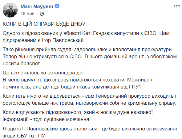 "Одного из подозреваемых в убийстве Кати Гандзюк выпустили из СИЗО. Этим подозреваемым является Игорь Павловский.