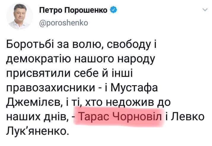 "Борьбе за свободу, свободу и демократию нашего народа посвятили себя и другие правозащитники - и Мустафа Джемилев, и те, кто не дожил до наших дней, - Вячеслав Чорновил и Левко Лукьяненко", - было указано в опубликованном сообщении. Затем оно было изменено и исправлено на его покойного отца Вячеслава Черновола.
