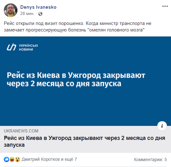 Генеральный директор агентства "Украинские новости" Денис Иванеско на своей странице в Facebook уточнил, что этот рейс был официально открыт Петром Порошенко. При этом анонсировалось, что его запустили спустя несколько лет перерыва. "Рейс открыли под визит Порошенко. Когда министр транспорта не замечает прогрессирующую болезнь "омелян головного мозга", - написал Иванеско в соцсети.