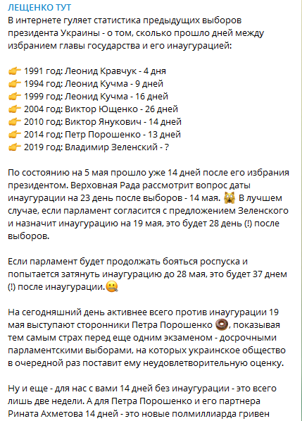 По состоянию на 5 мая прошло уже 14 дней после его избрания президентом. Верховная Рада рассмотрит вопрос даты инаугурации на 23 день после выборов - 14 мая. В лучшем случае, если парламент согласится с предложением Зеленского и назначит инаугурацию на 19 мая, это будет 28 день (!) после выборов.