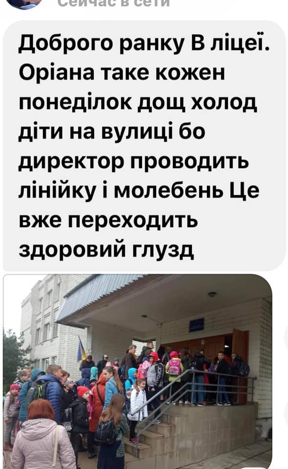 Ученики львовского лицея "Ориана", расположенного по адресу улица Чукарина, 3, каждый понедельник утром вынуждены и в дождь, и в холод выстраиваться на улице на линейку и молебен.