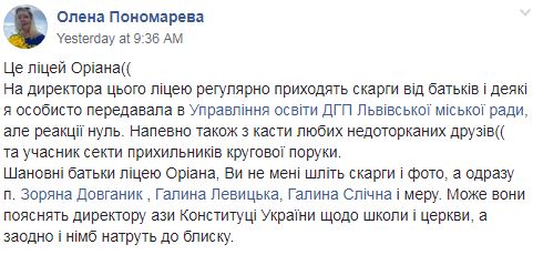 На такие принудительные молебны по понедельникам детей заставляет выходить директор лицея Сватко Юрий Иванович. Елена Пономарева пишет, что она и другие родители неоднократно жаловались в Управление образования Львовского городского совета, но там не реагируют на обращения.