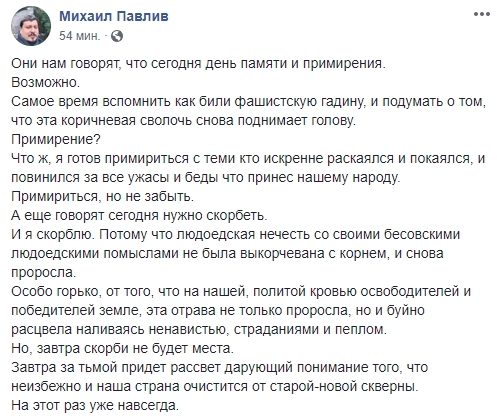 Политолог Михаил Павлив: "Они нам говорят, что сегодня день памяти и примирения. Возможно. Самое время вспомнить как били фашистскую гадину, и подумать о том, что эта коричневая сволочь снова поднимает голову.