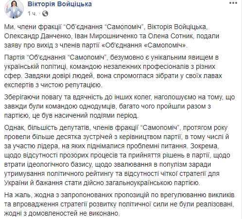 Народные депутаты Виктория Войцицкая, Александр Данченко, Иван Мирошниченко, Елена Сотник и Александр Опанасенко решили выйти из партии "Объединение "Самопомощь" вслед за Семеном Семенченко и Егором Соболевым. Об этом сообщил в Facebook лидер партии, мэр Львова Андрей Садовой и одна из депутатов.