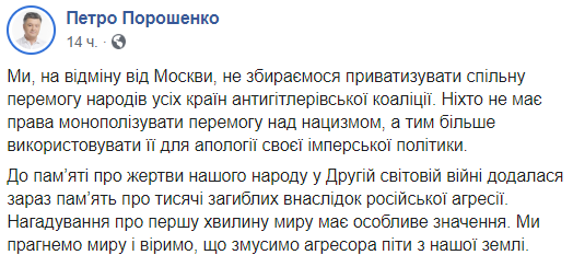 "Прочитала пост Владимира Зеленского. Пишут ему очень нейтральные и тщательно отработанные тексты. Даже День победы с маленькой буквы. Как в календаре государственных праздников. Кажется, на могиле своего деда, благодарен внук говорил бы не только о дне благодарности, а о Дне Победы (с большой буквы).