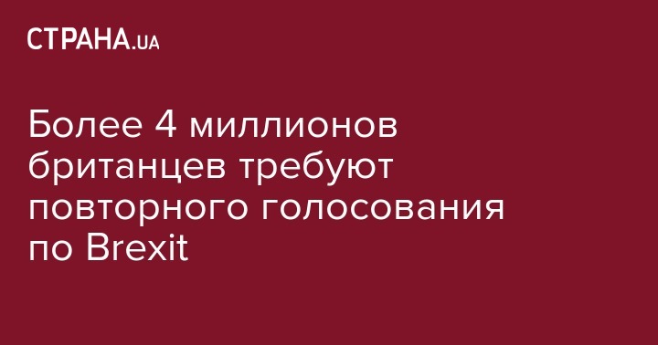 Более 4 миллионов человек подписали петицию с требованием провести повторное голосование за выход Великобритании из Евросоюза. Об этом сообщается на сайте британского парламента.