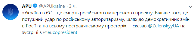 "Украина в ЕС - это смерть российского имперского проекта. Более того, это мощный удар по российскому авторитаризму, путь к демократическим переменам в России и на всем постсоветском пространстве", - приводит слова Зеленского на встрече с Туском пресс-служба Администрации президента Украины.