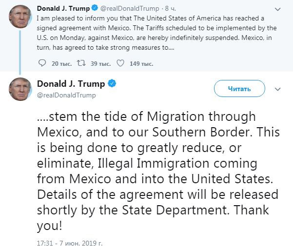 "Мне приятно сообщить вам, что США добились письменного соглашения с Мексикой. Пошлины в отношении Мексики, введение которых было запланировано на понедельник, таким образом, откладываются на неопределенный срок", - написал он.