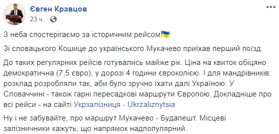 "И для путешественников: расписание разрабатывали так, чтобы было удобно ехать дальше по Украине. В Словакии также хорошие пересадочные маршруты по Европе. Ну и не забывайте о маршруте Мукачево - Будапешт. Местные железнодорожники говорят, что направление сверхпопулярное", - прокомментировал запуск нового поезда Кравцов.