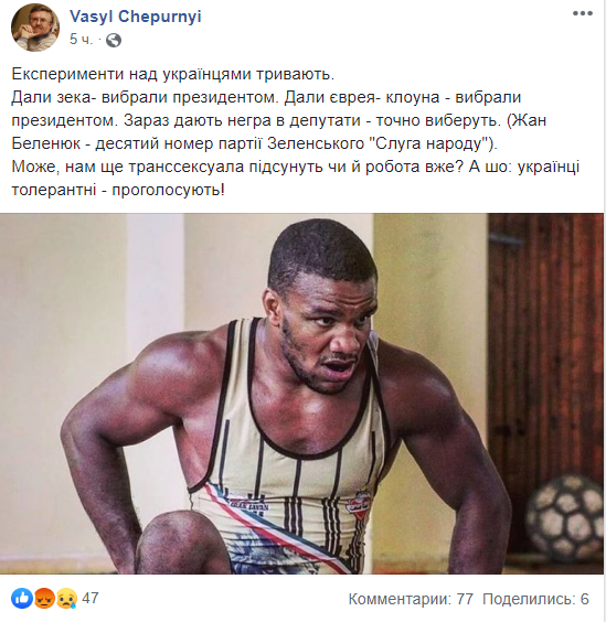 Напомним, что после публикации первой двадцатки партии "Слуга народа", Чепурной выразил недовольство тем, что в украинском парламенте может появиться первый темнокожий депутат. "Эксперименты над украинцами продолжаются. Дали зека - выбрали президентом. Дали еврея- клоуна - выбрали президентом. Сейчас дают негра в депутаты - точно выберут (Жан Беленюк - десятый номер партии Зеленского "Слуга народа"). Может, нам еще транссексуала подсунут ли работа уже? А что: украинцы толерантны - проголосуют!", - написал он.