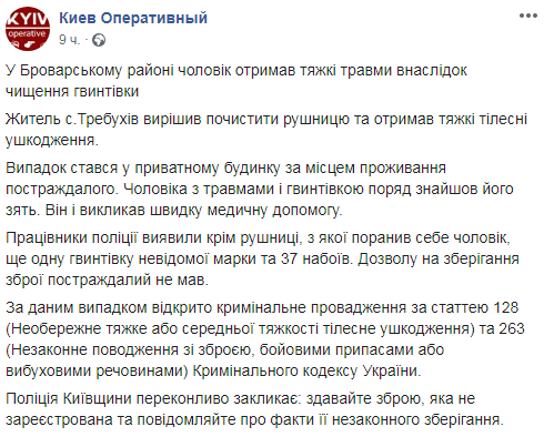 В селе Требухов Броварском районе Киевской области мужчина получил тяжелые травмы в результате ЧП во время чистки винтовки. Оно произошло в частном доме по месту жительства пострадавшего.