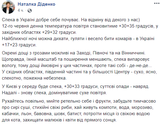 "Жара в Украине хорошо себя чувствует. в отличие от некоторых из нас", - замечает синоптик. По словам Натальи Диденко, в западных областях температура днем будет +29...+32 градуса. Ближайшей ночью будет немного прохладнее. "Можно дышать, гулять и весело бить комаров - в Украине +17...+23 градуса", - написала она.