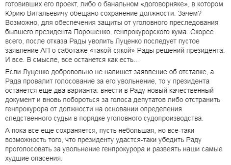 Он объясняет, что Рада не сможет уволить генпрокурора по основаниям, изложенным в представлении президента. "И о том, что внесение в парламент "непроходного" документа свидетельствует либо о некомпетентности сотрудников АП, готовивших его проект, либо о банальном "договорняке", в котором Юрию Витальевичу обещано сохранение должности. Зачем? Возможно, для обеспечения защиты от уголовного преследования бывшего президента Порошенко, генпрокурорского кума. Скорее всего, после отказа Рады уволить Луценко последует пустое заявление АП о саботаже "такой-сякой" Рады решений президента. И все. В смысле, все останется как есть", - считает юрист.