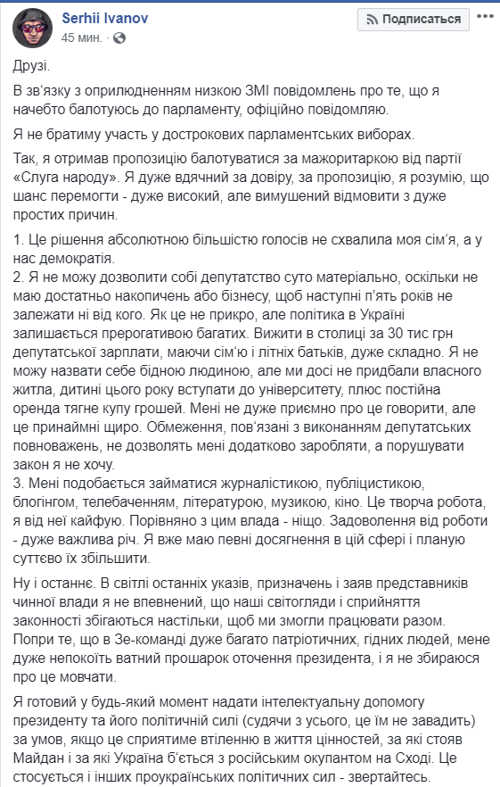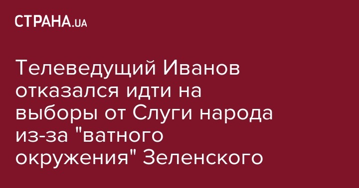 Блогер и ведущий телеканала 1+1 Сергей Иванов заявил, что отказывается баллотироваться на выборах в Верховную Раду от партии президента Украины Владимира Зеленского "Слуга народа". Об этом он сообщил на своей странице в Facebook.