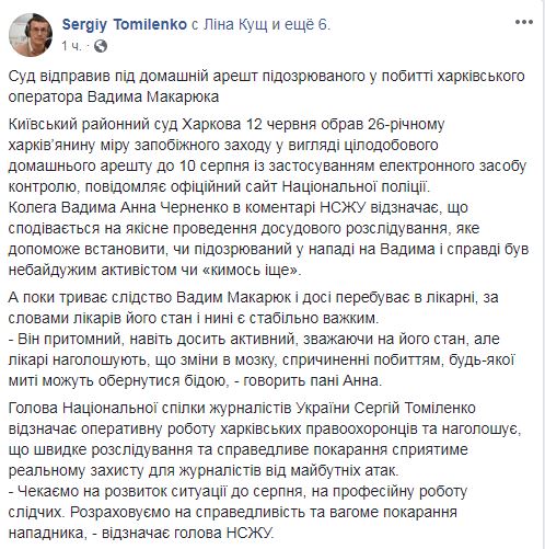 Суд отправил под домашний арест подозреваемого в избиении харьковского оператора Вадима Макарюка. Последний находится в больнице в стабильно тяжелом состоянии. Об этом сообщил в Facebook председатель НСЖУ Сергей Томиленко.