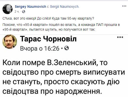 Пользователи оценили шутку Черновола как неудачную. "Похоже, что "95-й квартал" пошёл во власть, а команда ПАП прошла в "95-й квартал", пытается шутить, но получается вот так", - пишет Сергей Наумович и приводит пост политика.