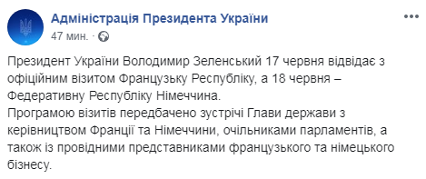 В понедельник, 17 июня, президент Зеленский посетит с официальным визитом Францию. На следующий день, 18 июня он прилетит в Германию.