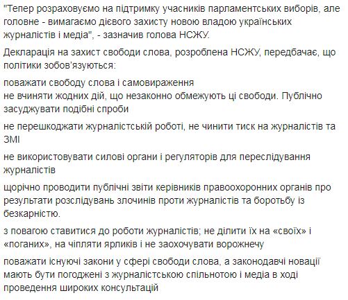 Декларация в защиту свободы слова, разработанная НСЖУ, предполагает, что политики обязуются: