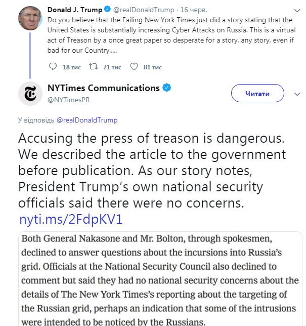 Напомним, что в статье The New York Times, опубликованной в субботу, 15 июня, утверждается со ссылкой на источники, что Вашингтон в течение последнего года участил попытки внедрить в энергосистему России вредоносное программное обеспечение. С его помощью США якобы могут собирать информацию о российской энергосистеме, а также, предположительно, отключить какие-то ее элементы. Трамп в субботу в Twitter опроверг утверждения газеты. Он также обвинил ее в "фактической госизмене" и причинении вреда интересам США.