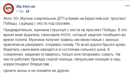 По данным паблика Dtp.kiev.ua, погибшему оторвало голову. На дороге видны следы крови, части черепа и мозга. Под мусоровозом остались основные части тела. Информресурс также утверждает, что мужчина специально ждал на мосту транспорт, под колесами которого он не сможет выжить.