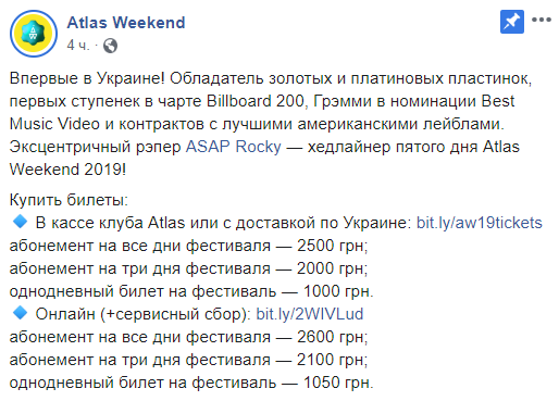 В Киеве  меньше чем через месяц стартует один из крупнейших музыкальных фестивалей Украины Atlas Weekend, его организаторы сообщили имя музыканта, который выступит хедлайнером заключительного дня 13 июля. Это популярный рэпер A$AP Rocky. об этом говорится на официальной странице организаторов в Facebook.