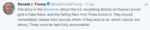 "Статья в The New York Times об участившихся атаках США на российскую энергосистему является лживой новостью, и находящаяся в упадке The New York Times это знает. Они должны немедленно раскрыть свои источники, которые, если они вообще существуют, в чем я сомневаюсь, являются фальшивкой", - написал президент США.