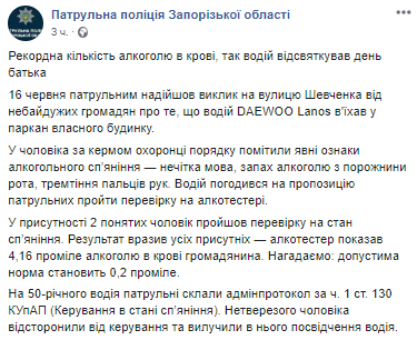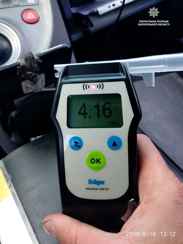 В Запорожье полицейские задержали водителя с рекордным уровнем алкоголя в крови. Об этом на своей странице в соцсети сообщает патрульная полиция области.