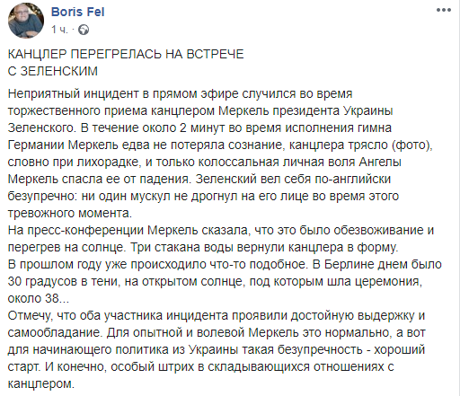 "Только колоссальная личная воля Ангелы Меркель спасла ее от падения. Зеленский вел себя по-английски безупречно: ни один мускул не дрогнул на его лице во время этого тревожного момента. В прошлом году уже происходило что-то подобное. В Берлине днем было под 30 градусов, утомительная церемония шла на открытом воздухе. Отмечу, что оба участника инцидента проявили достойную выдержку и самообладание. Для опытной и волевой Меркель это нормально, а вот для начинающего политика из Украины такая безупречность - хороший старт. И конечно, особый штрих в складывающихся отношениях с канцлером", - написал он на своей странице в Facebook.