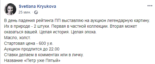 "В день падения рейтинга ПП выставляю на аукцион легендарную картину. Их в природе - 2 штуки. Первая в частной коллекции. Вторая может оказаться вашей. Целая история. Целая эпоха. Масло, холст. Стартовая цена - 600 у.е.", - написала она.
