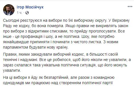 Экс-радикал Игорь Мосийчук также заявил, что сегодня регистрируется на выборы по 94 избирательному округу."В Верховную Раду не хожу, потому что она умерла. Если правки не разоблачат закон О выборах с открытыми списками, то приду проголосовать. Все остальное - это профанация и шоу, а не политика. Шоу, которое нужно как можно быстрее прекращать и начинать с чистого листа. С новым парламентом строить новую страну", - заявил он.