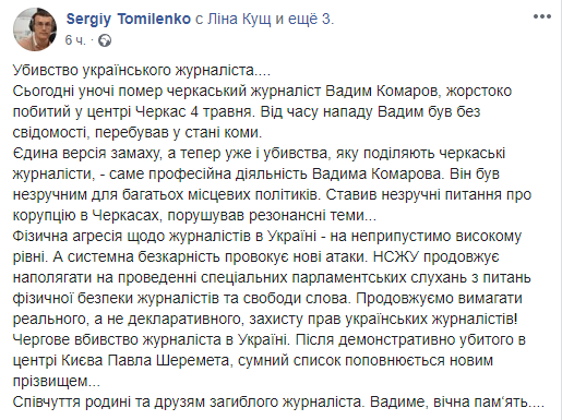"Сегодня ночью умер черкасский журналист Вадим Комаров, жестоко избитый в центре Черкасс 4 мая. С момента нападения Вадим был без сознания, находился в состоянии комы. Единственная версия покушения, а теперь уже и убийства, которую разделяют черкасские журналисты - именно профессиональная деятельность Вадима Комарова. Он был неудобным для многих местных политиков. Ставил неудобные вопросы о коррупции в Черкассах, поднимал резонансные темы..." - написал Сергей Томиленко.