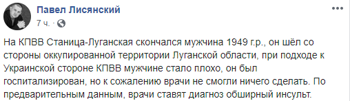 "На КПВВ "Станица-Луганская" скончался мужчина 1949 г.н., он шел со стороны оккупированной территории Луганской области, во время подхода к украинской стороне КПВВ мужчине стало плохо, он был госпитализирован, но, к сожалению, врачи не смогли ничего сделать", - сказано в сообщении.