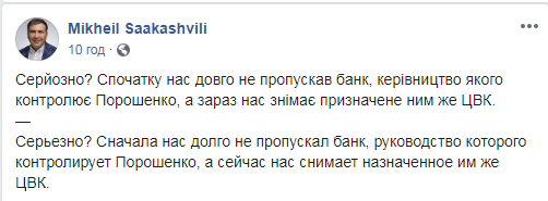 "Серьезно? Сначала нас долго не пропускал банк (Имеется ввиду Нацбанк Украины - Прим.Ред.), руководство которого контролирует Порошенко, а сейчас нас снимает назначенный им же ЦИК", - написал Михаил Саакашвили.