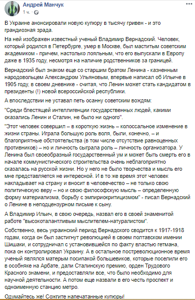 Журналист Андрей Манчук с иронией назвал размещение Вернадского на купюре зрадой, учитывая, что он был "маститым советским академиком" и был награжден Сталинской премией.