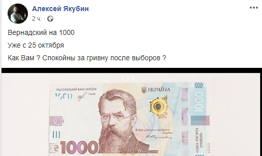"Вернадский на 1000. Уже с 25 октября. Как Вам? Спокойны за гривну после выборов?", - написал политолог Алексей Якубин.