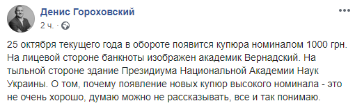 "25 октября текущего года в обороте появится купюра номиналом 1000 грн. На лицевой стороне банкноты изображен академик Вернадский. На тыльной стороне здание Президиума Национальной Академии Наук Украины. О том, почему появление новых купюр высокого номинала - это не очень хорошо, думаю можно не рассказывать, все и так понимаю". - написал политический эксперт Денис Гороховский.