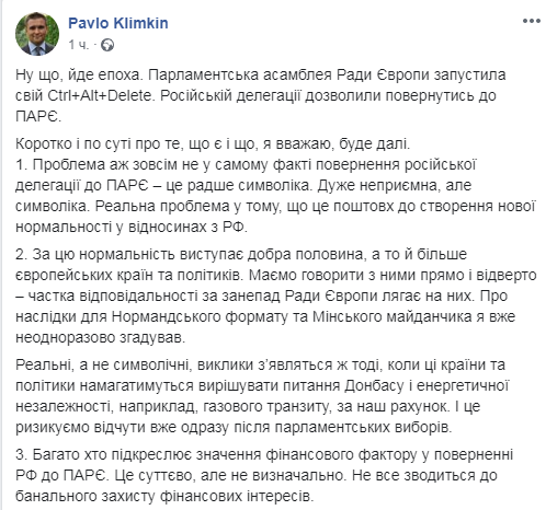 Также он подчеркнул, что Совет Европы утратил украинское доверие, приняв решение вернуть в ПАСЕ делегацию России. "Из лидера усилий по защите прав человека организация превратилась в простого менеджера, причем такого себе", - отметил Климкин.